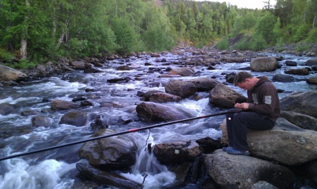 För första gången (som jag har minne av) så upplever jag nu midnattssol. Klockan tolv i natt stod jag och Kenny nere i ån och fiskade bäcköring i dagsljus. Hur konstigt som helst! (Bilderna nedan är tagna vid midnatt igår)