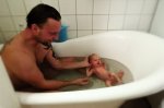 Häromdagen så badade vi skrutten för första gången och självklart så hade jag googlat innan på hur man skulle gå tillväga. Min plan var att sätta honom i badbaljan men Kenny ville hellre bada med honom och hade inget emot att bada i ”bara” 37 grader (burr) om han fick göra det med lilla skrutt.
