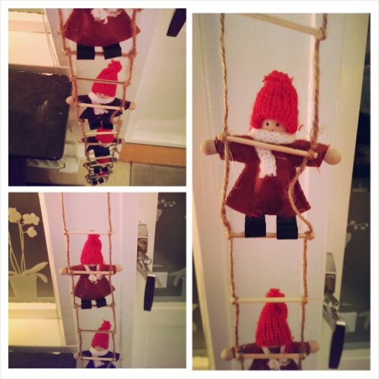 Igår kväll så sprang Kenny upp på vinden och hämtade ner påsen med julsaker. Påsen innehåller tre stjärnor och två ljusbollar. Idag kompletterades den med en ”tomtestege”. Jag sa igår att jag inte höll på med ”tomtar och troll”, men tomtestegen från mamma var så fin så den fick åka upp också.