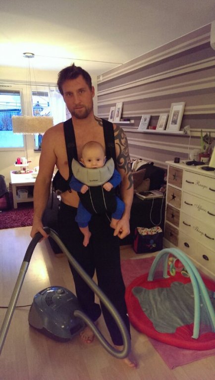 Här visar Kenny vilka konster man kan utföra med en BabyBjörn på magen.