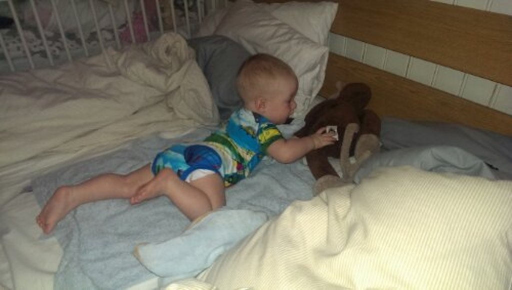 Det går sådär att försöka lägga en bebis som fått två timmars extra sömn! Dessutom så kom han på ett nytt trick igår i sängen, han skulle öva på krypning, just där och då. Det gick inte att få honom att ligga på rygg utan han välte över till mage hela tiden och låg och ålade.