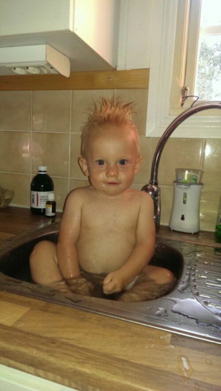 Idag var jag och vattnade rabatten i gamla huset och Felix lekte då i hallen. När Felix började krypa mot utgången så lät jag honom vara för tröskeln och sedan trappsteget är så pass låga att han borde kunna nå båda med armarna.