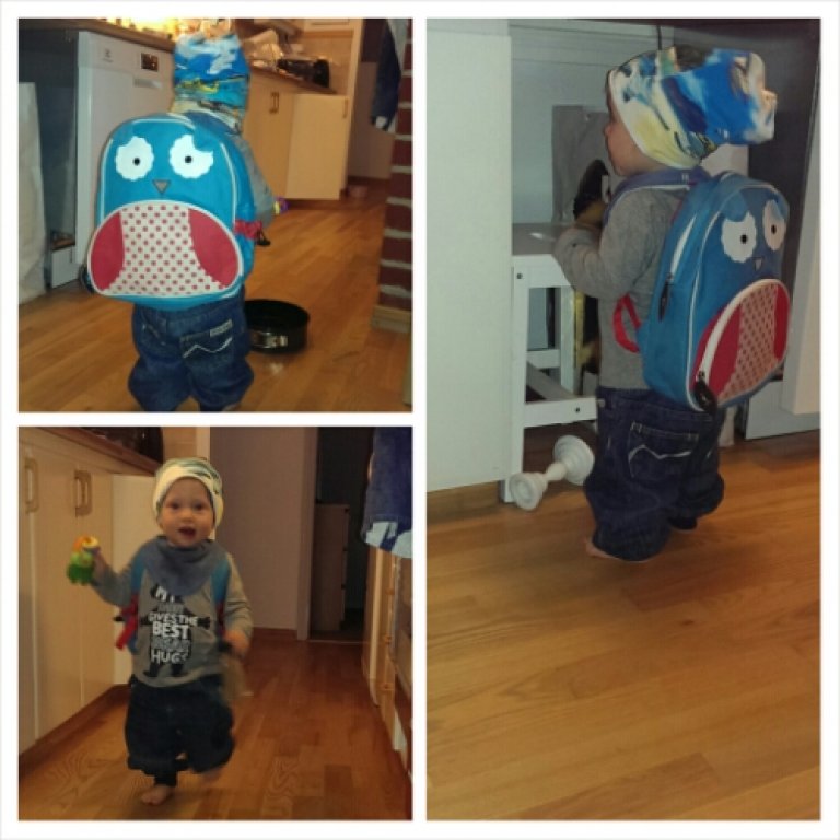 Felix är kittad för kommande utflykter också i sin nya ryggsäck och mössa från kompis Jenny. ❤