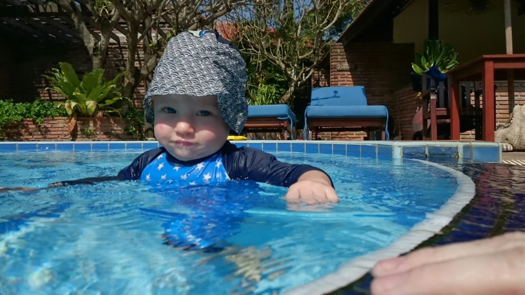 Vi har inte bara en utomhusbebis utan en badbebis också. Men han skulle verkligen behöva lära sig simma eftersom han bara rusar ut i vattnet utan någon kontroll.