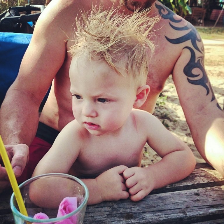 I morse efter frukost så gick Kenny ner till havet med Felix för att bada bort kaskadspyan som han fått på kläderna efter att ha druckit nästan ett helt glas juice.