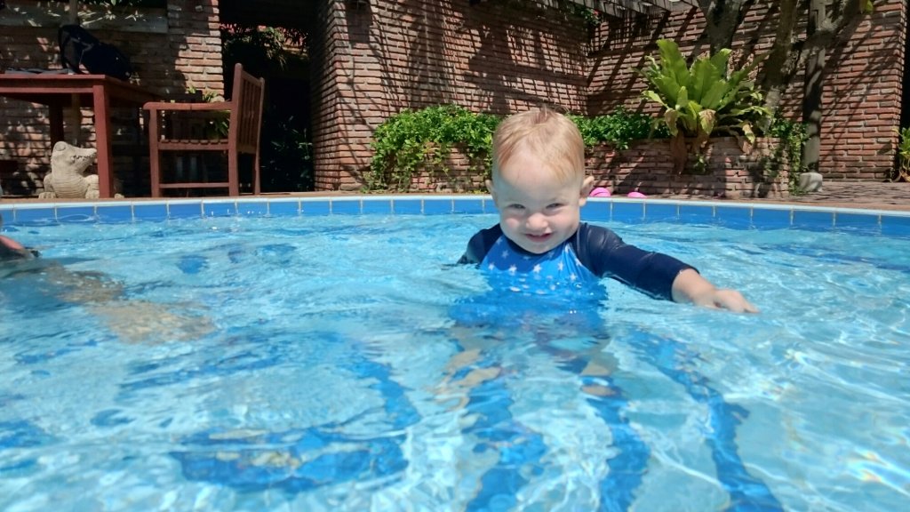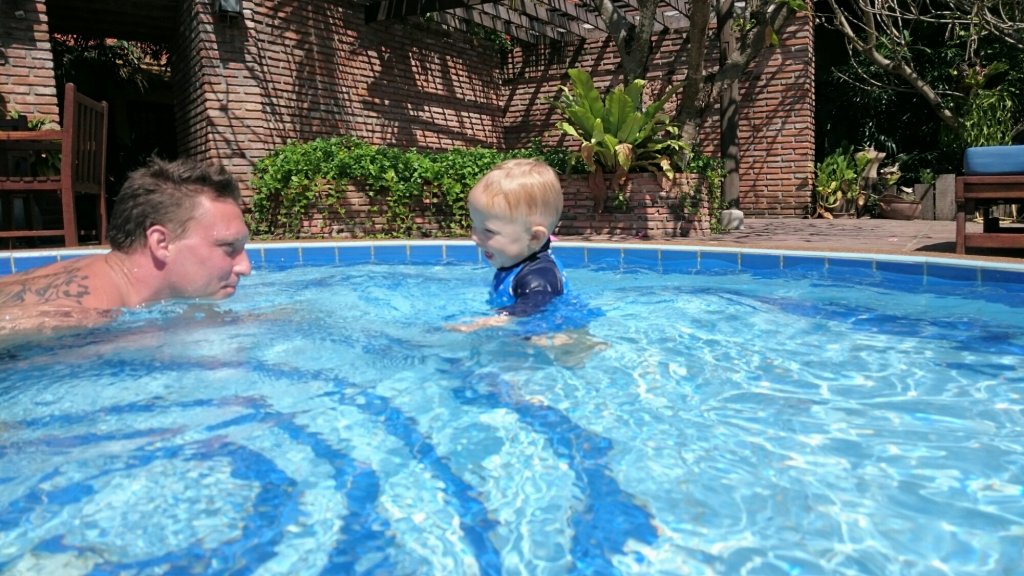 När jag sedan kom ut till poolen en halvtimme senare så var Felix fortfarande lika nöjd och glad med att bada.
