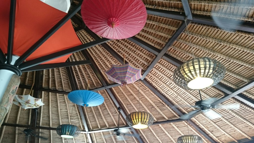 När vi närmade oss Koh Samui så byggdes molnen upp utanför och blixten for över himlen hit och dit. Väl nere på landningsbanan så var det som att någon stod och spolade av planet på taket, för det rann ned för fönsterrutorna.