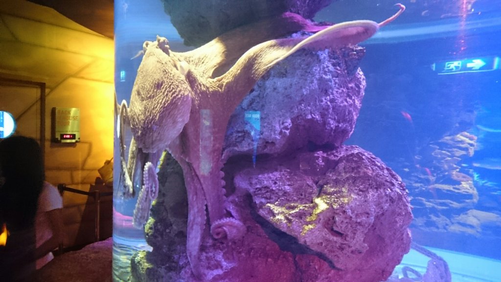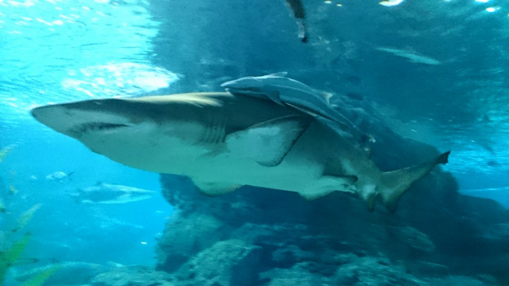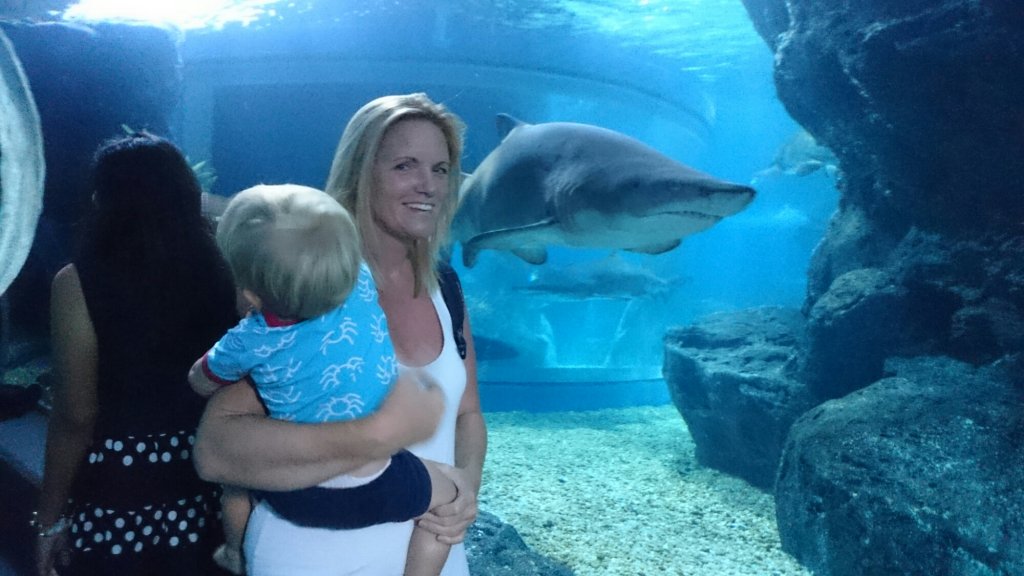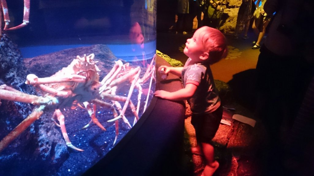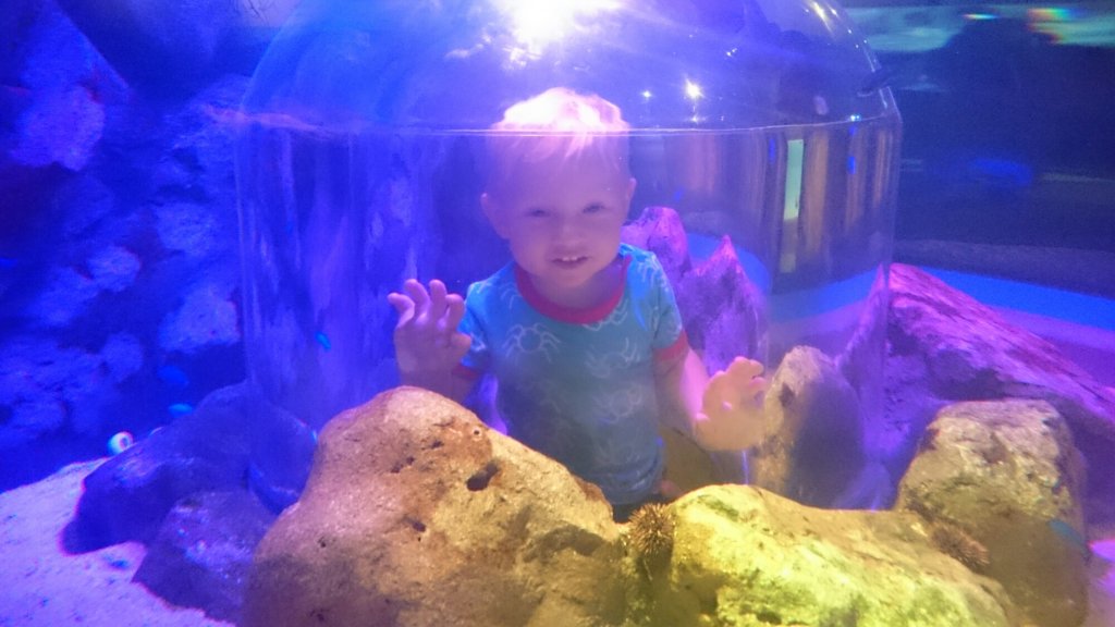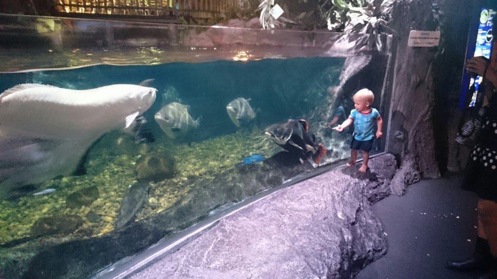 I en sektion så var det en stor tank med fiskar och hajar under oss och man fick titta på dom genom glasgolvet. Det tyckte Felix var jättekonstigt, han stod på kanten mellan vanliga golvet och glasgolvet och tittade frågande på mig som stod ”mitt ute i vattnet”.