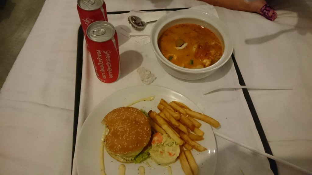 Det blev en julmiddag på hamburgare och Tom Yum-soppa på rummet. Planen var ju att vi skulle somna tidigt, men det blir sällan som planerat.