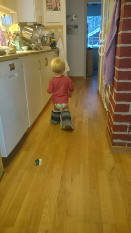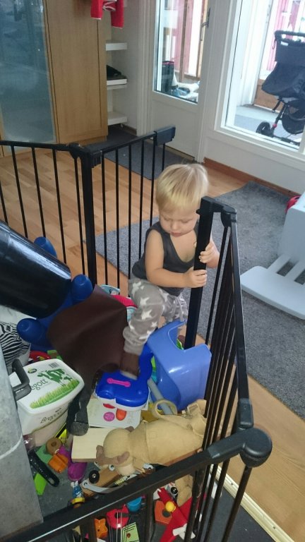 Det här är någon ny grej som jag INTE är förtjust i! ALLT som inte sitter fast i väggar eller golv hamnar för ögonblicket i ”buren” framför spisen. Det ser jätterent och städat ut i resten av huset eftersom allt ligger vid spisen men det är fortfarande inte okej. Det här måste vi få bukt med snarast!