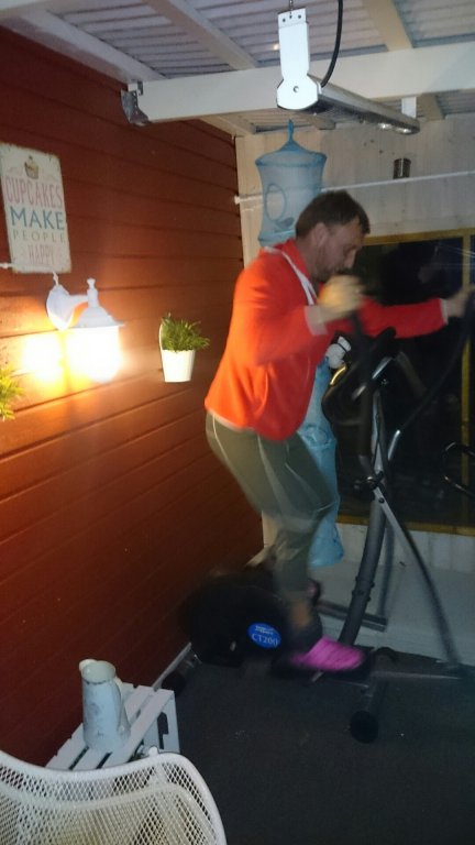 På altanen så har vi den här fina maskinen, en crosstrainer. Jag försöker att använda den ett par gånger i veckan för att få röra lite på kroppen. Häromdagen så stod jag på den och pratade i telefon med pappa och jag kommer inte ihåg vad han frågade men mitt svar var i princip ”haha, nej Kenny skulle aldrig orka ställa sig på den här”, vilket Kenny hörde, och ja, ni fattar, dagen efter så stod han förstås där.