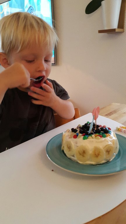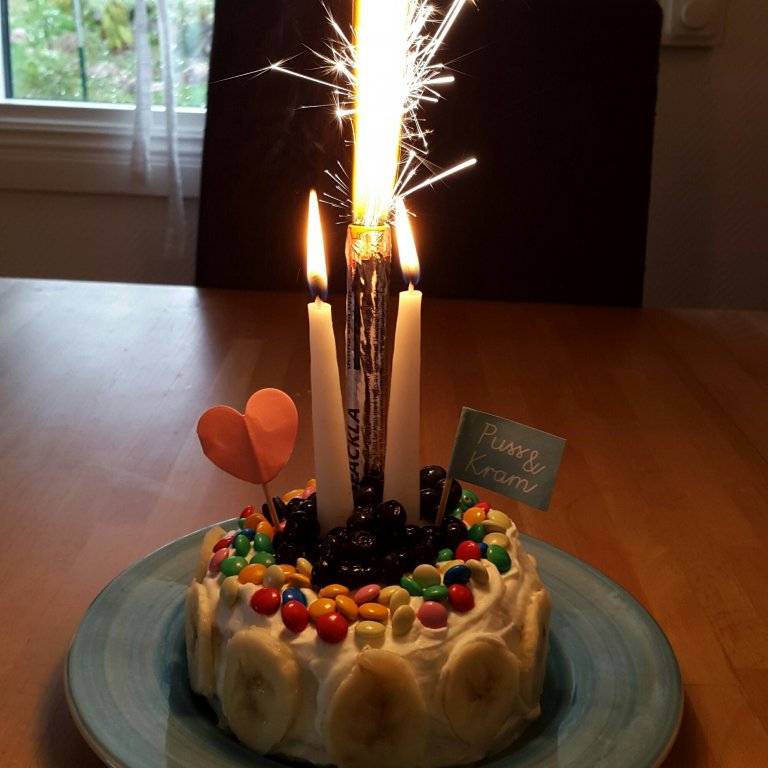 Den tårta jag stått och bakat kvällen innan hade lika gärna kunnat vara en uppochnervänd plastbytta med grädde på för han åt bara upp godiset och blåbären ovanpå tårtan innan han sloknade ihop av febern igen. Det blev alltså en väldigt lugn dag men så söndagen så var han i topp igen, feberfri och full av energi.