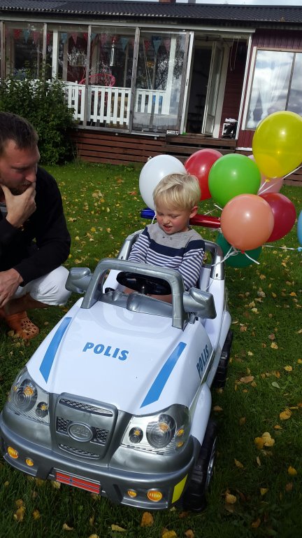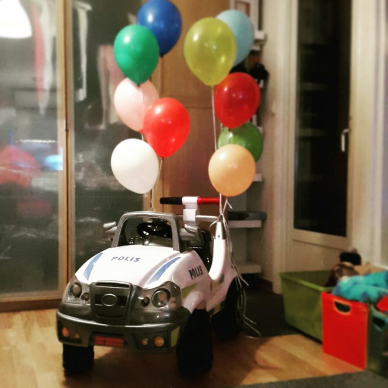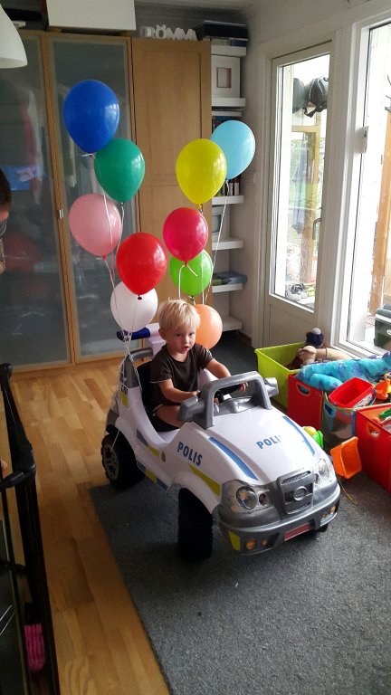 När han vaknade på lördag morgon och stapplade ut till pottan i vardagsrummet så såg han alla ballongerna i taket vilket ledde honom runt hörnet där hans polisbil stod. Han blev jätteglad.