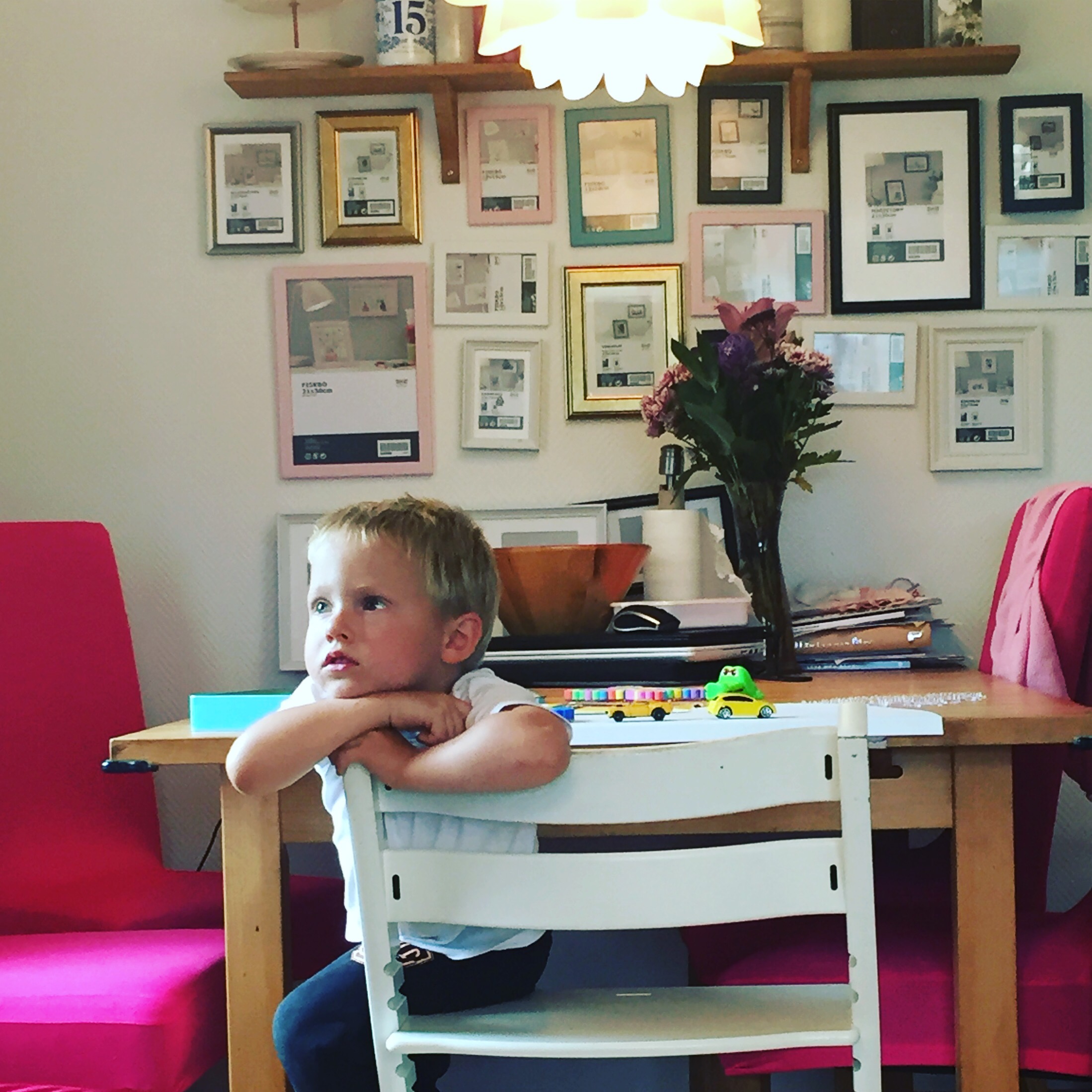 Vid kassan så går Felix och Kenny förbi för att underlätta uppläggningen på varubandet och betalningen. Jag hör Felix ropa på mamma eller pappa, långt bort från andra sidan längan med kassor. Och i nästa ögonblick är han bredvid mig. Vad går han på?