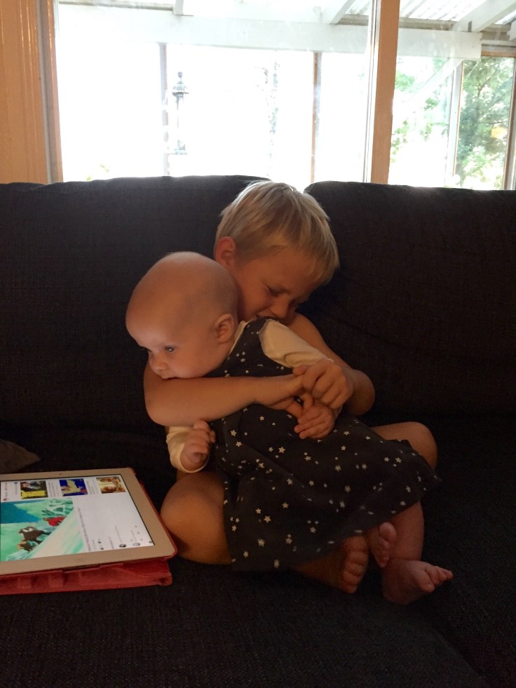 När jag idag bad honom hjälpa mig att hålla i henne, då blev det lite jobbigt. Det är lite samma känsla som med Nisse, att han skitar ner sig genom att röra lillasyster. När hennes små fingrar eller fötter rör honom flyttar han sig långt bort från henne i soffan, så ni förstår vad det tog emot att ”hjälpa”mamma att hålla i henne.