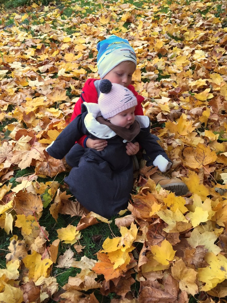 Bilden här ovanför fick jag till genom att muta Felix med en kaka, den säkraste metoden att få igenom något (men ändå en sällsynt muta). -Felix, om du sätter dig i löven och håller i din lillasyster så får du en kaka. Han fick två.