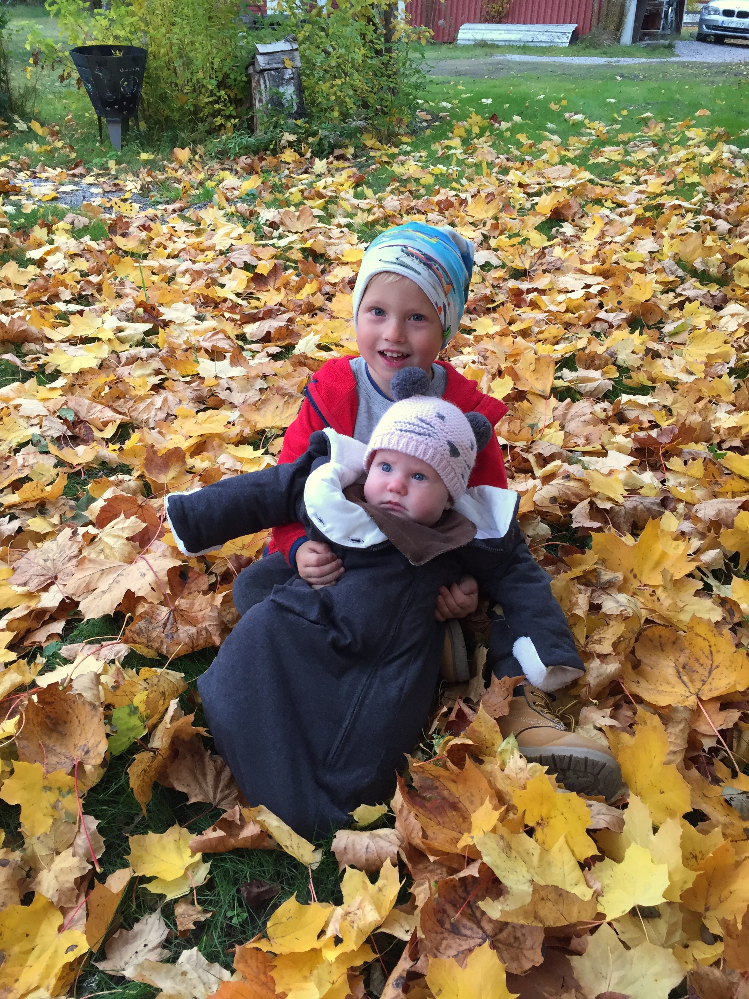 Bilden här ovanför fick jag till genom att muta Felix med en kaka, den säkraste metoden att få igenom något (men ändå en sällsynt muta). -Felix, om du sätter dig i löven och håller i din lillasyster så får du en kaka. Han fick två.