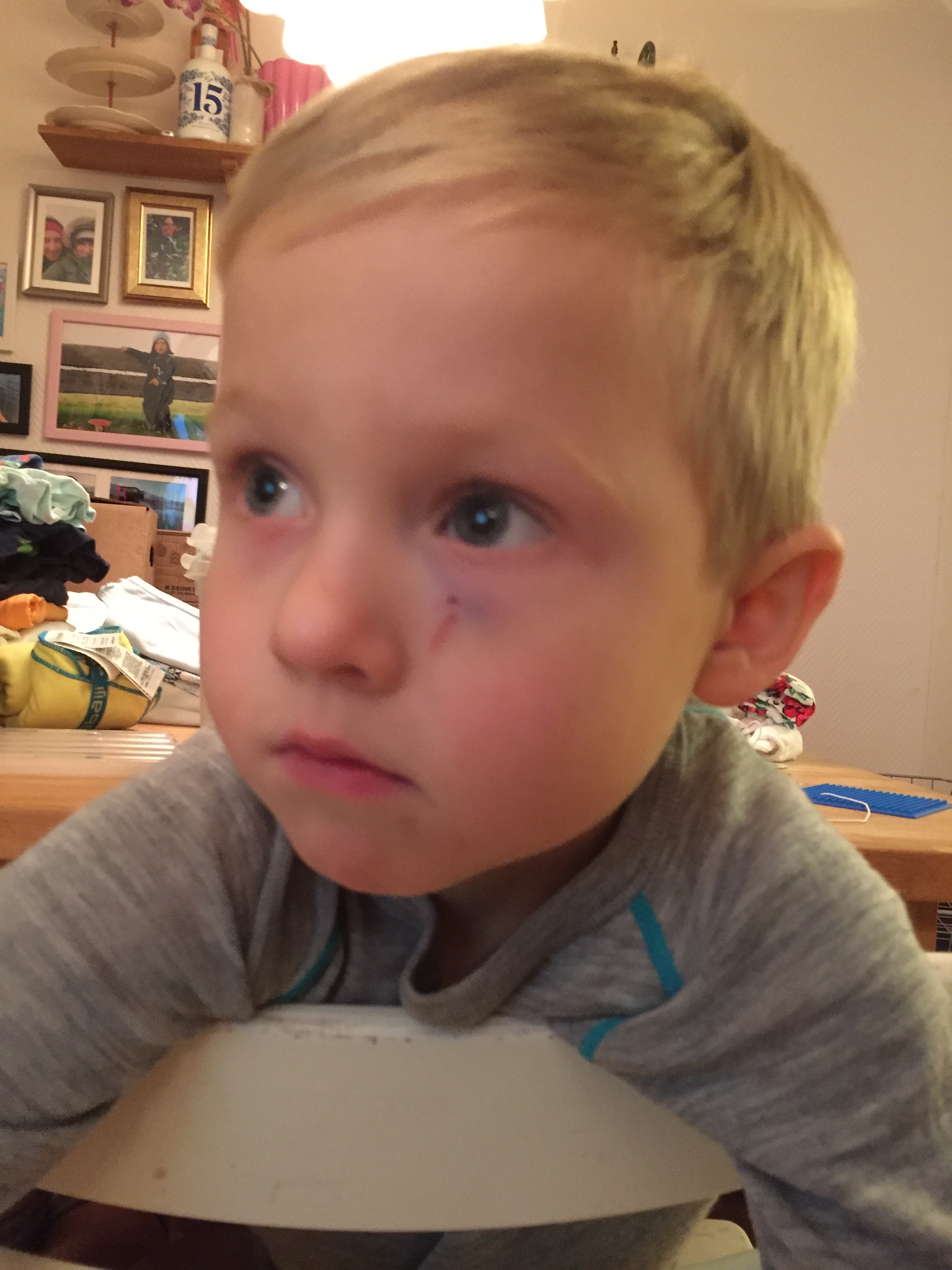 Han utmanar mig och efter ett antal hot så tar jag halsbandet. Då börjar Felix skrika och när jag inte svarar honom så börjar han fejkgråta. När jag klappar honom på kinden så blir han jättearg för att jag tog bort den tår han lyckats klämma fram.