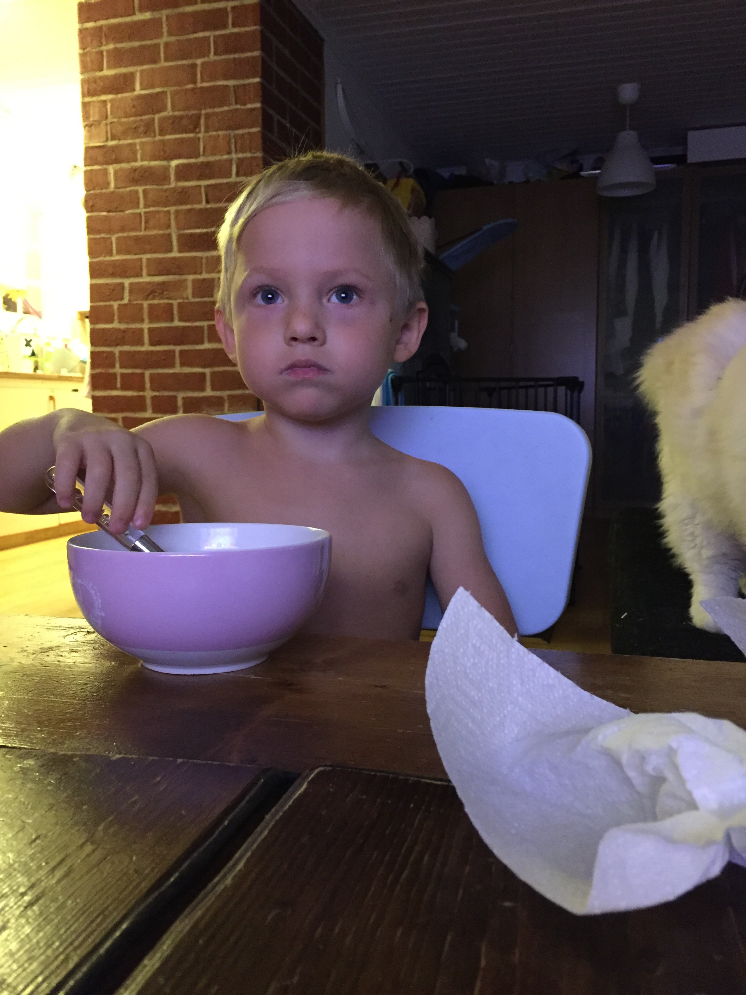 I morse när barnen började vakna så pruttade Tuva, då hurrade Felix för henne fyra gånger. Jag misstänker att det har att göra med vårt firande av Felix toalettbestyr på semestern. Han behöver ha det lite tryggt när han ska bajsa, det ska helst ske hemma på pottan, annars kan det vara. När vi var på semester utan potta så blir det därför lite obehagligt och han skjuter upp behovet. Därför ”firade” vi hans bajskorvar med godisbjörnar och hurrarop under semestern för att uppmuntra och det har han nog tagit med sig hem.