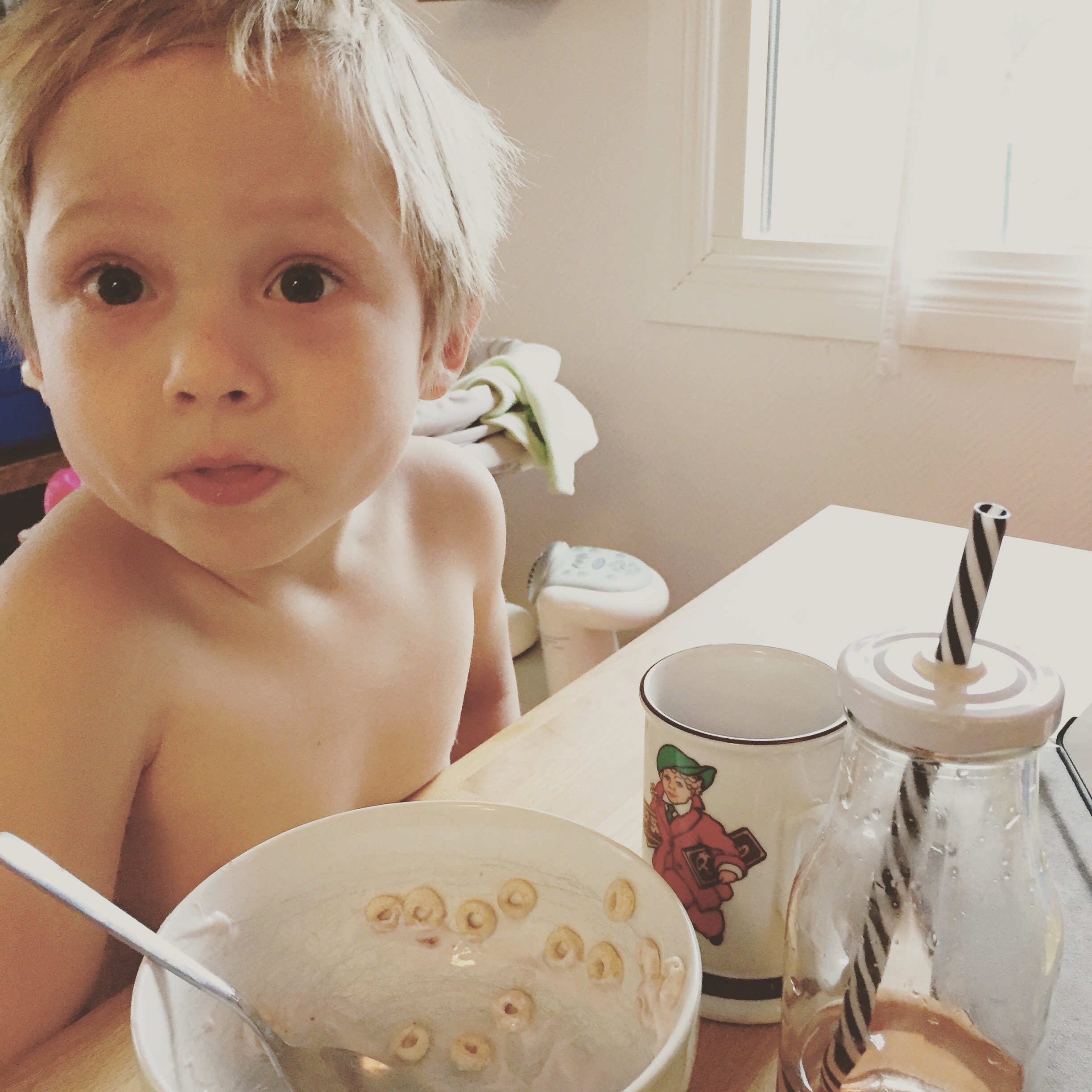 Vi låg brevid varandra och drog oss en timme i sängen, surfandes, för att sedan äta frukost tillsammans i lugn och ro. Eller ja..har ni sett det där klippet med sengångaren som kryper fram i slowmotion som florerar runt på Facebook med texten ”när man har bråttom till dagis”? Det är Felix, han har det från sin pappa. 😘