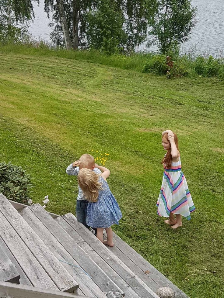 Men, eftersom mamma och Peter lånade med sig Felix upp till Dalarna över midsommar så lät vi traktens invånare dansa själva runt midsommarstången. Vi var där förra året, då Tuva var precis nykläckt. Det duggregnade och Felix var sur. Han tyckte det var okej att titta på de som dansade i ett par minuter och sen ville han gå hem. Han ville absolut inte vara med och sjunga och dansa i alla fall.