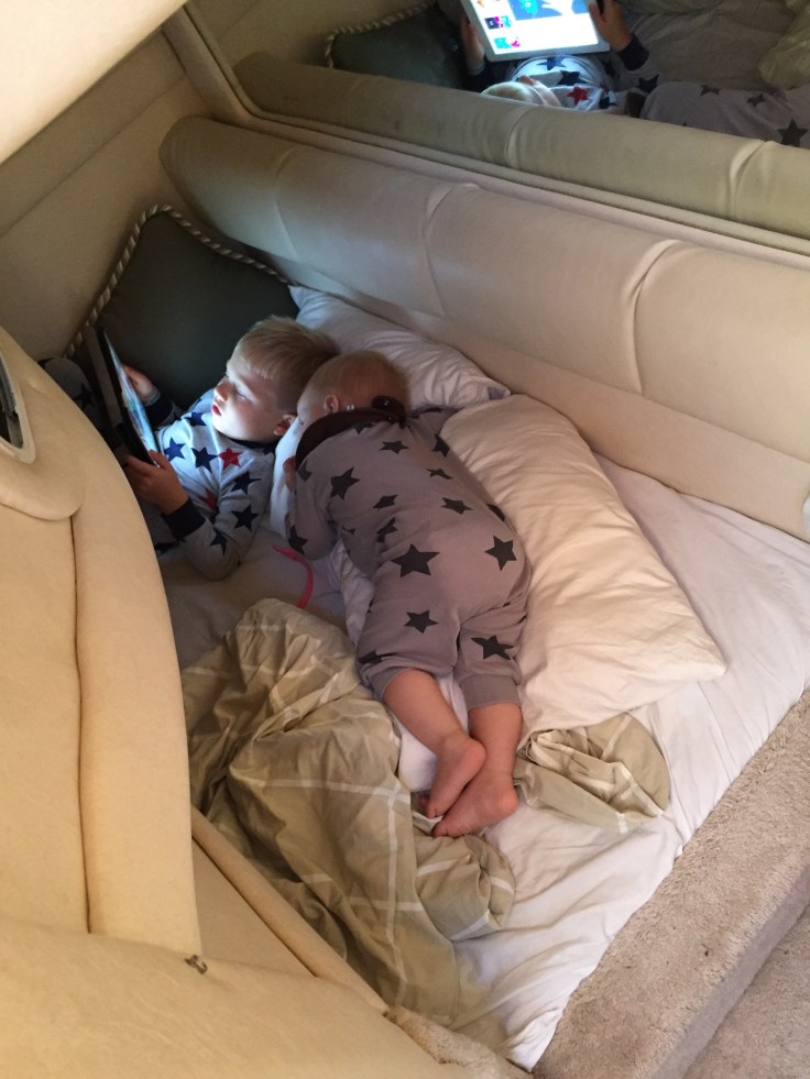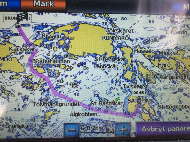 Under natten så upplevde jag något nytt i mitt liv. Jag vaknade efter någon timmes sömn och hade en obehaglig känsla. Jag kände mig instängd mot väggen i utrymmet under däcket. Jag försökte somna om men vaknade om och om igen tills jag insåg atr det inte skulle fungera. Jag tror jag fick någon slags lightversion på klaustrofobi. Till slut gav jag upp och tog med mig täcke, kudde och Tuva till förpiken där jag sov resten av natten utan några bekymmer. Hm!