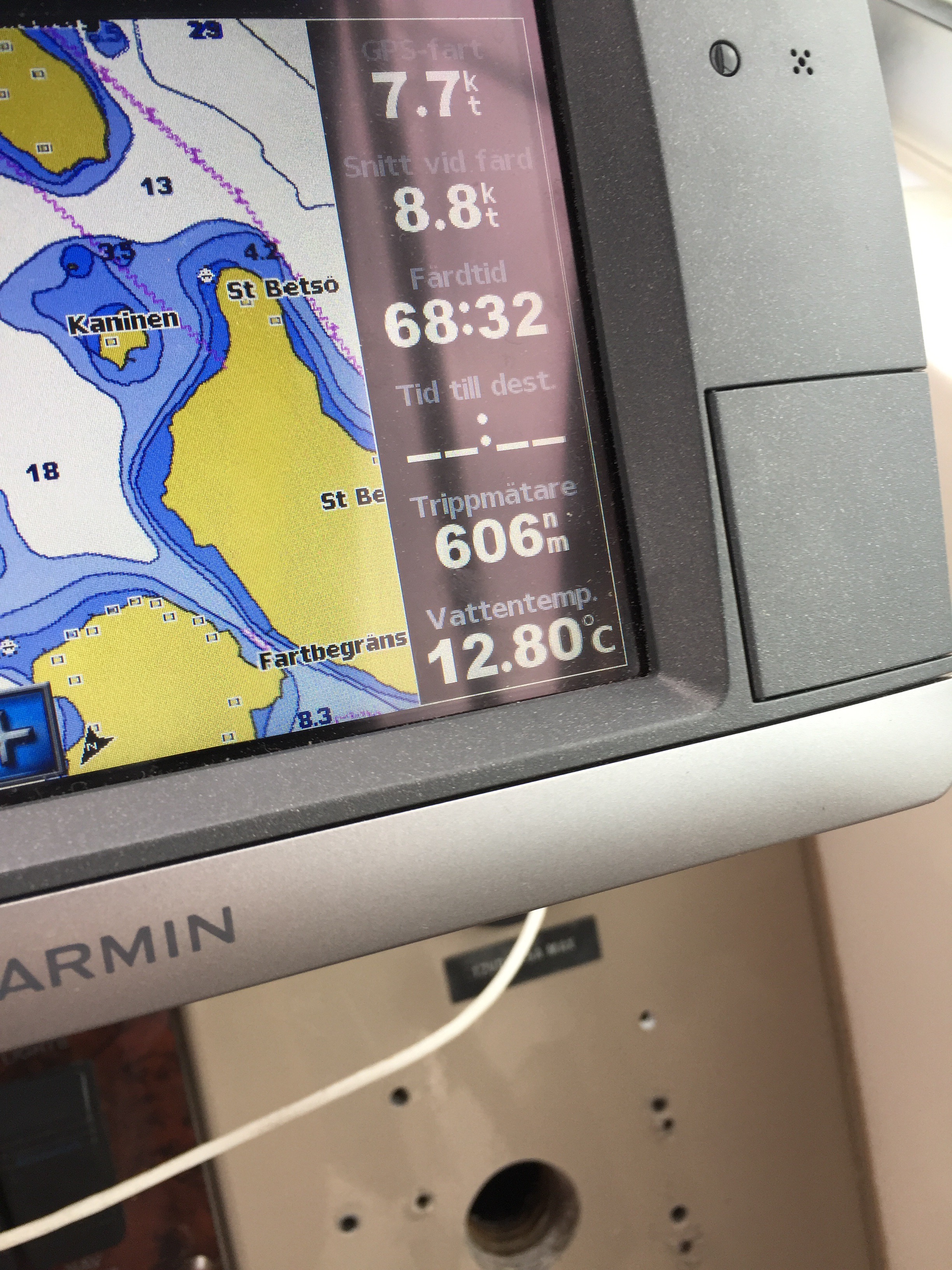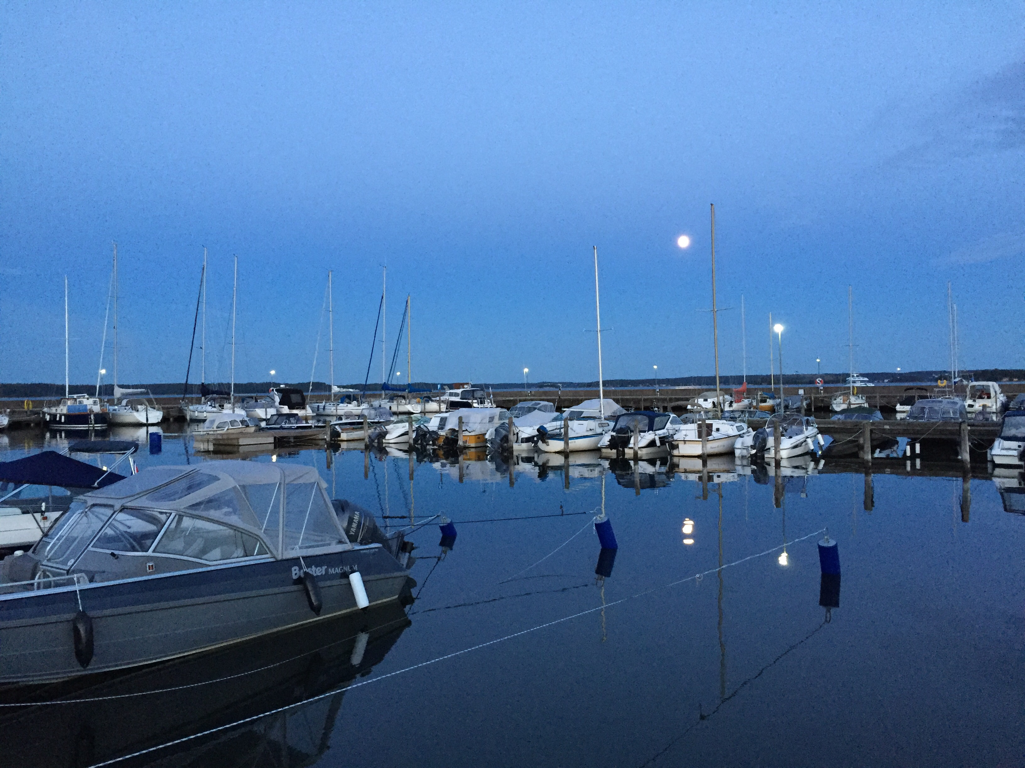 Under natten så upplevde jag något nytt i mitt liv. Jag vaknade efter någon timmes sömn och hade en obehaglig känsla. Jag kände mig instängd mot väggen i utrymmet under däcket. Jag försökte somna om men vaknade om och om igen tills jag insåg atr det inte skulle fungera. Jag tror jag fick någon slags lightversion på klaustrofobi. Till slut gav jag upp och tog med mig täcke, kudde och Tuva till förpiken där jag sov resten av natten utan några bekymmer. Hm!