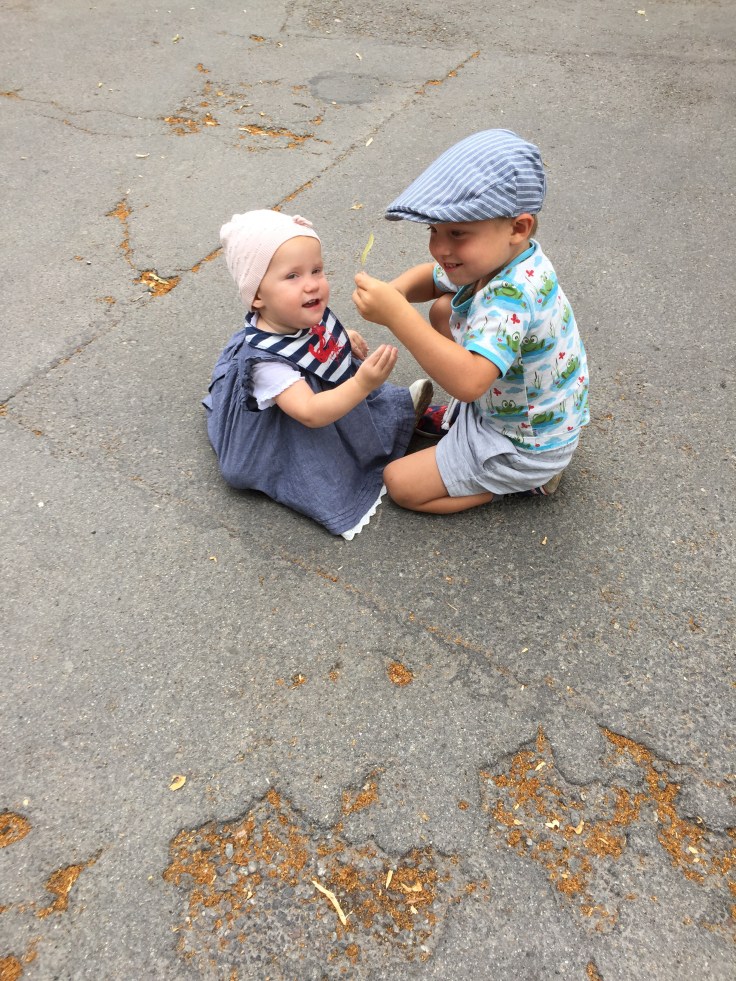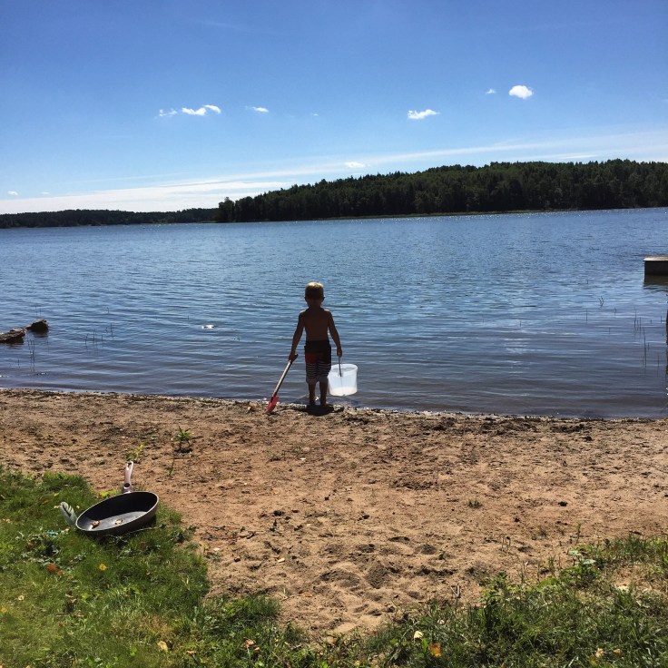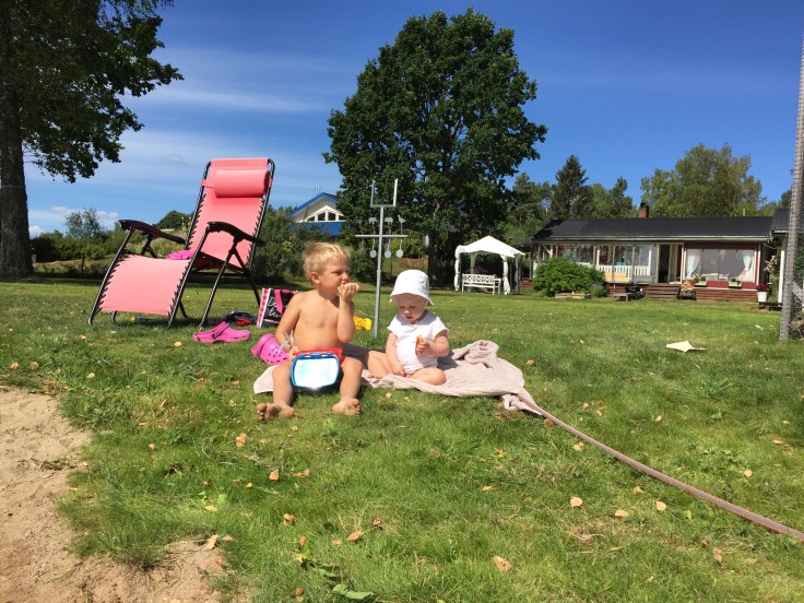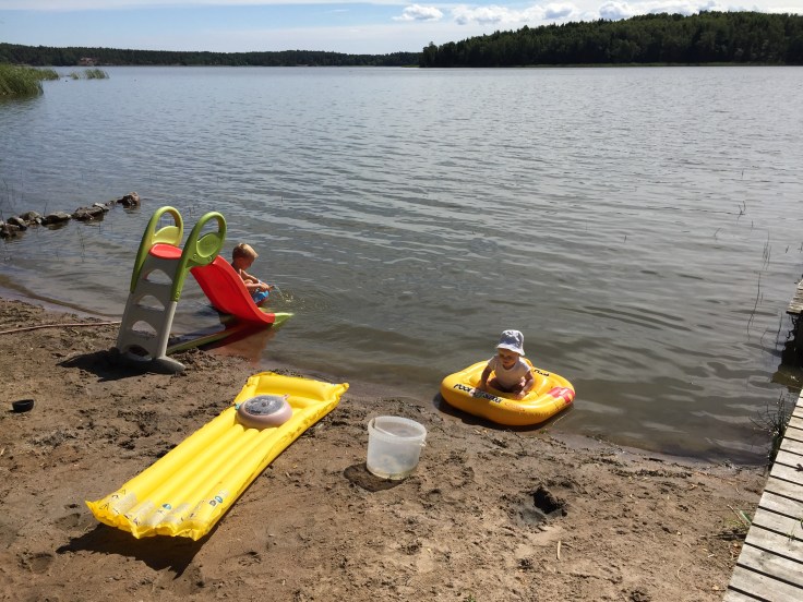 Jag ville inte skicka iväg Felix ensam i ringen så han fick sitta i Willes knä. Det gick ganska bra till pappa släppte av dem 20 meter från bryggan och vågorna gjorde så att ringen välte med båda killarna.