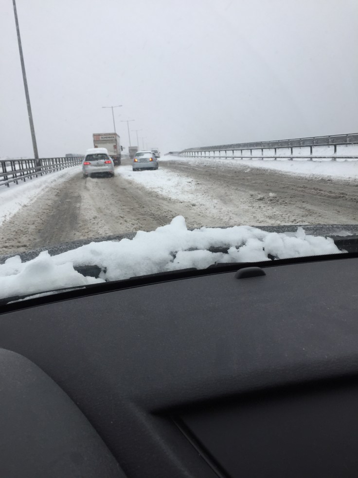 Det tog mig tre timmar in till stan, sicksackandes mellan stillastående lastbilar och bussar som låg i diken eller som kanat av vägen. Bara på vägen ut till ”stora” vägen hos oss så låg det en skåpbil och två lastbilar i diket. Underlaget på vägen var som att köra på en tvättbräda, snöslask som hunnit frysa innan plogbilen nått fram. Någon sån såg jag inte ens till igår, de satt väl fast.