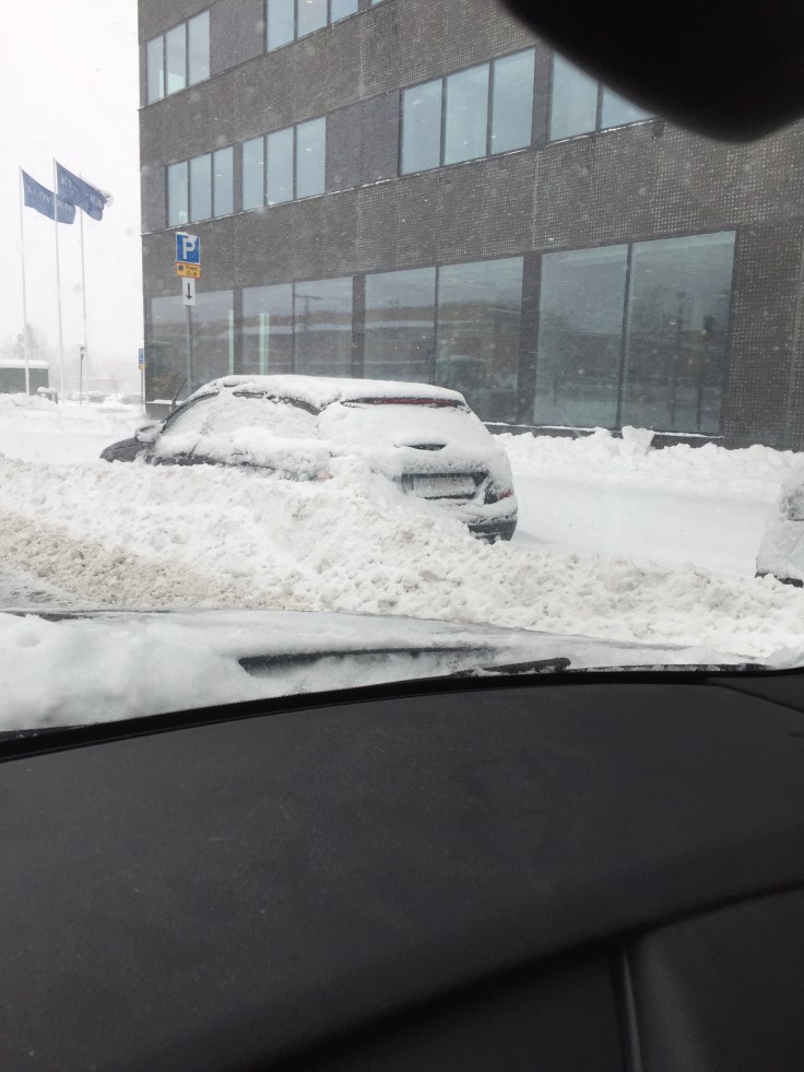 Väl inne i stan så var det tomt på bilar, så annorlunda. Folk kastade sig fram mellan vattenpölar och snöhögar i ett försök att rädda sina lågskor?! Hur tänker man där undrar jag? Själv hade jag kängor förstås och extra varma kläder i bilen, ifall.
