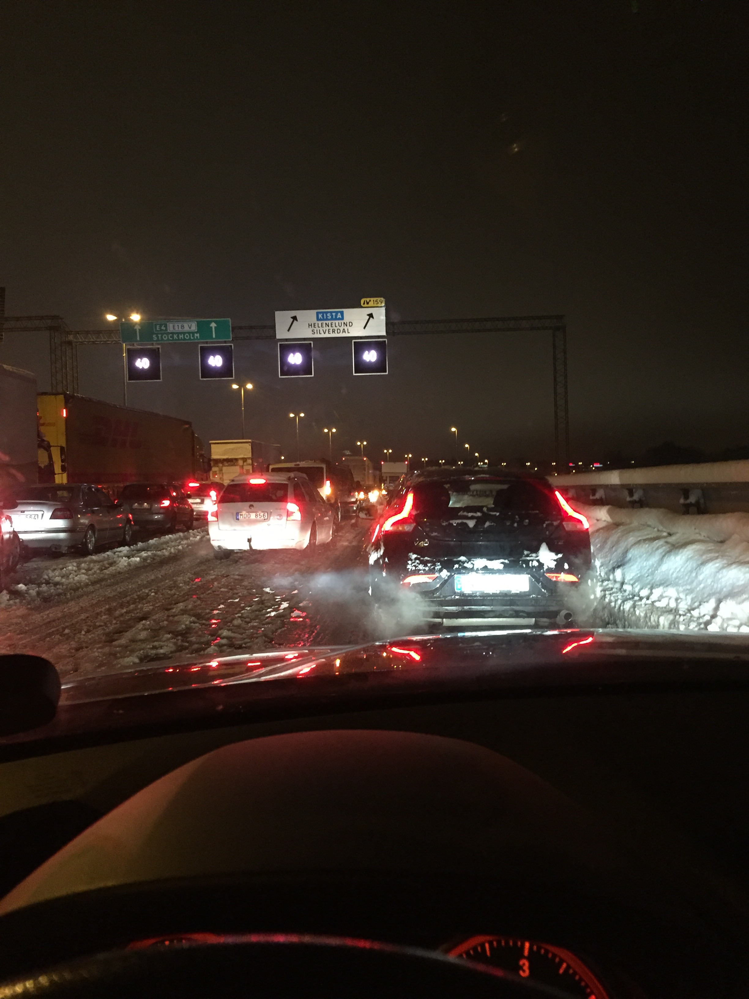 När vi rullade hemåt runt halv åtta så var det bättre. På den kilometerkorta 30-sträckan vid Karolinska stod det sex övergivna SL-bussar på jämt avstånd från varandra. Vad ska dem ut att göra utan vinterdäck?