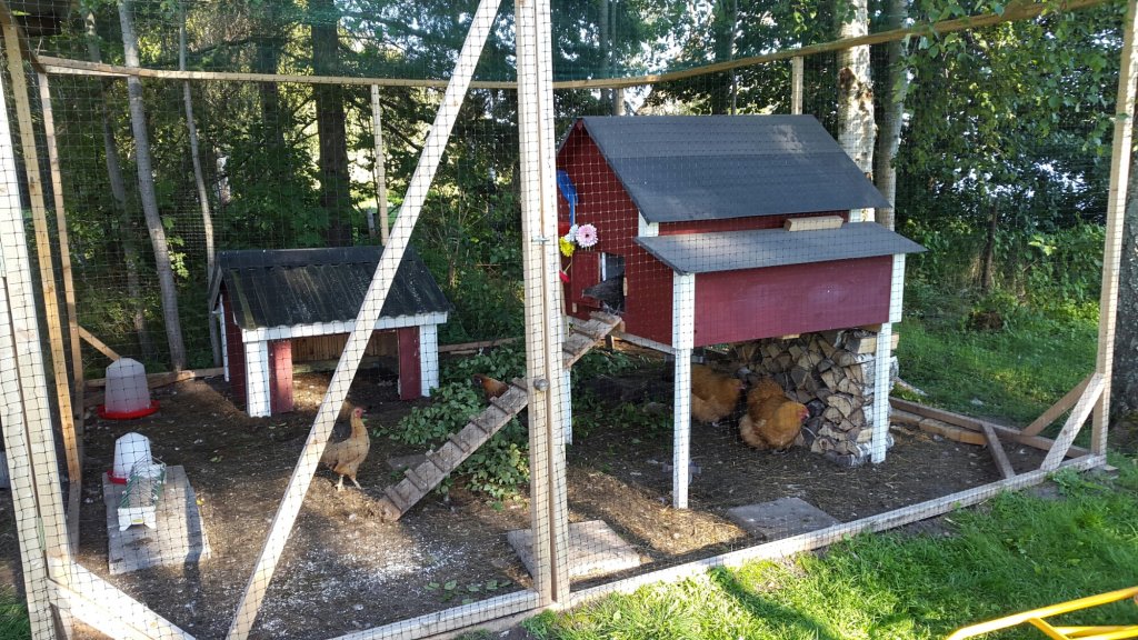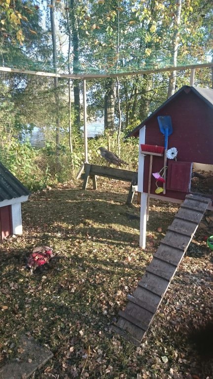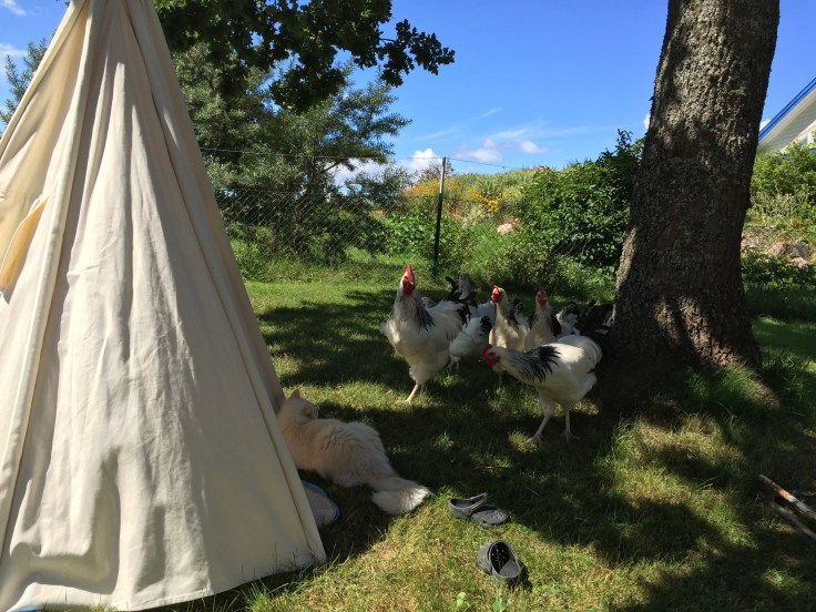 Än så länge verkar de inte komma upp i hönshuset via rampen så hönan ligger ute med ungarna på natten. Eftersom hönsens mest optimala sovtemperatur är fem grader så passar det ju utmärkt med att det är svensk sommar nu.