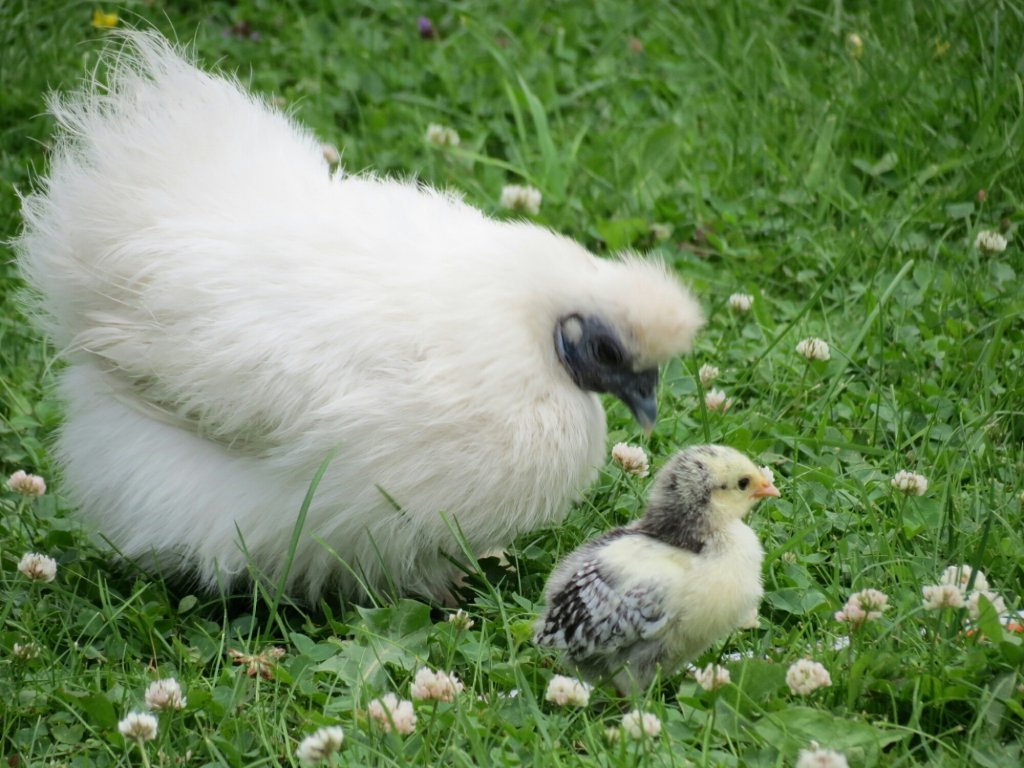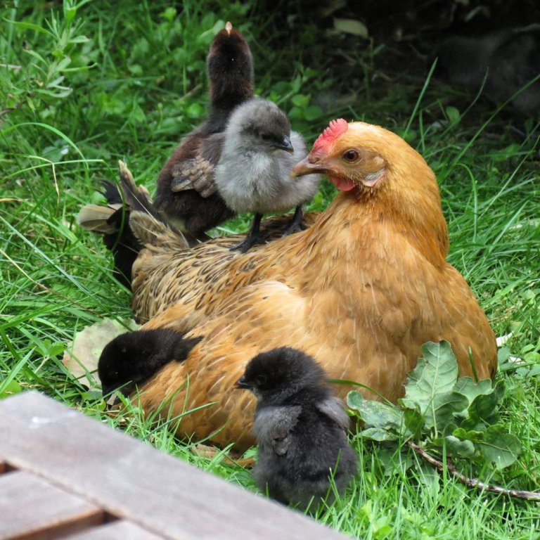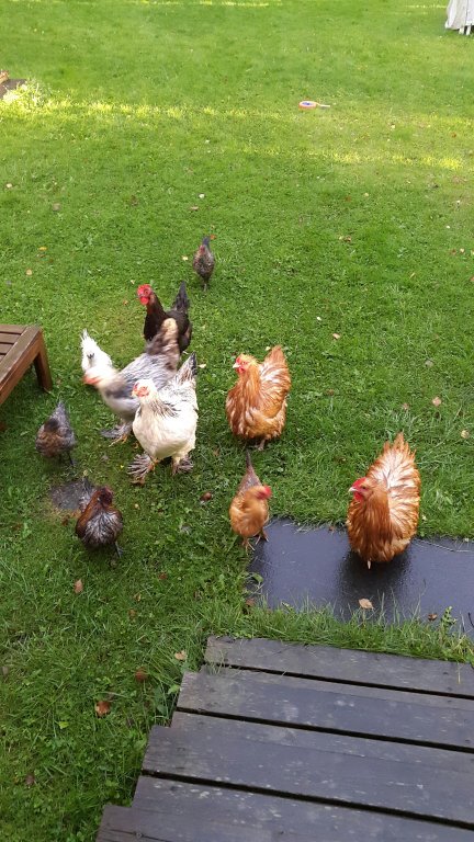 Kycklingarna verkar nu må väldigt bra och de verkar helt och hållet acceptera sin nya adoptivmamma. De springer runt i hönsgården och piper och försöker att inte reta de stora hönsen för mycket, men kommer det rester från köket så är de minsann snabba på att roffa åt sig maten.