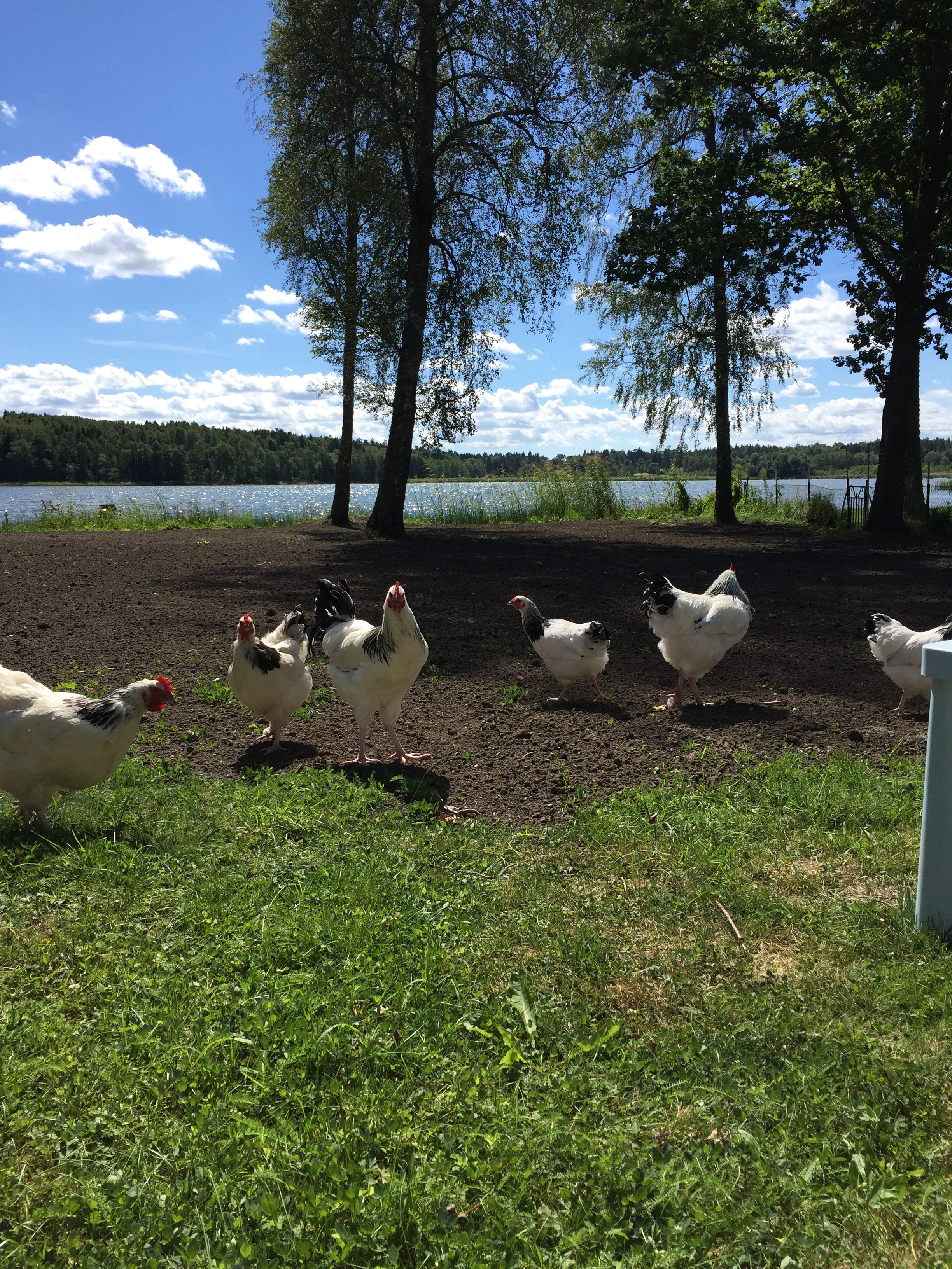 Om en höna kan se förvånad ut så gjorde hon det, en väldigt kort stund, sedan började hon skrika åt oss att hålla oss undan och fick medhåll från sina kacklande vänner.