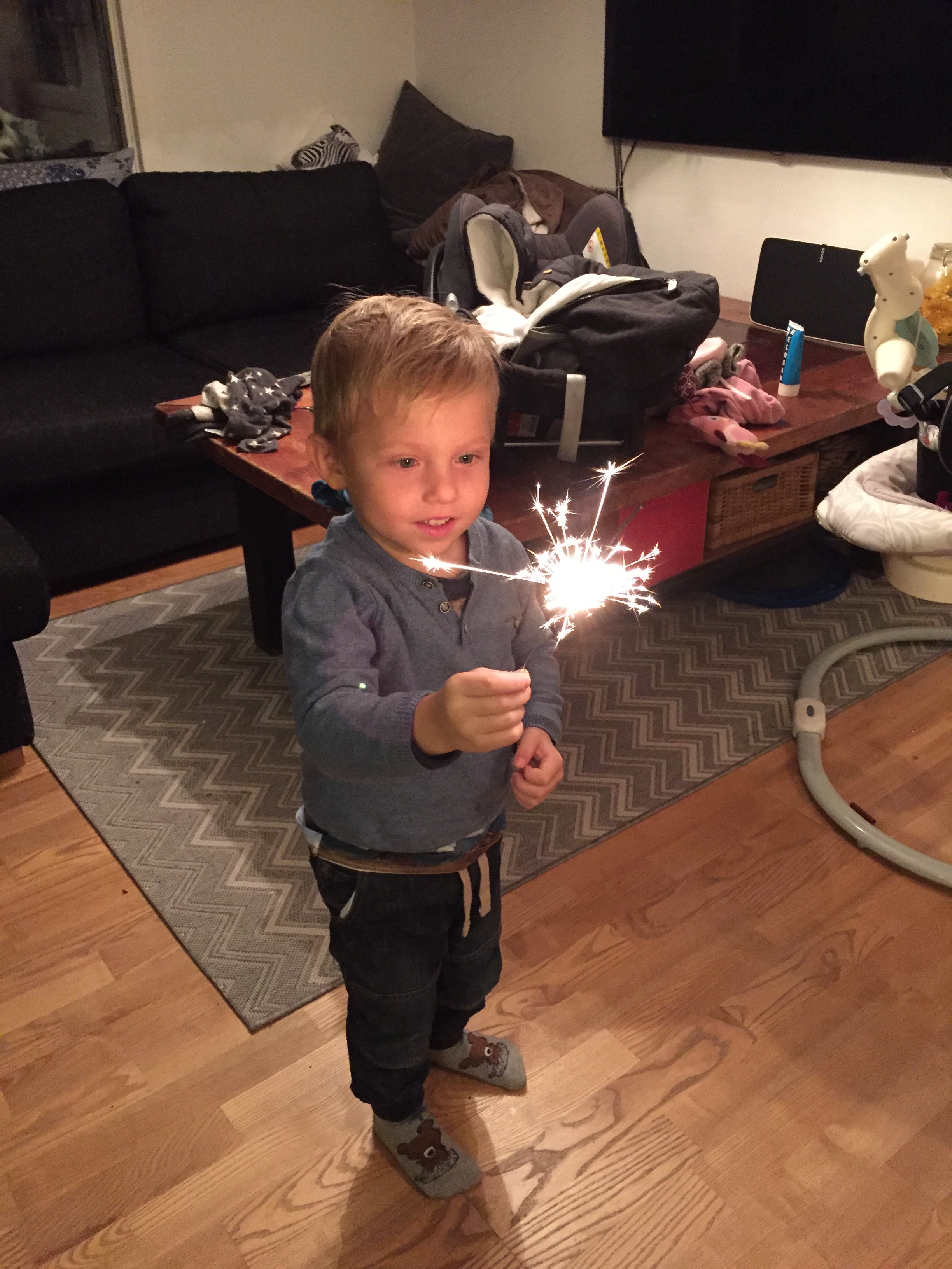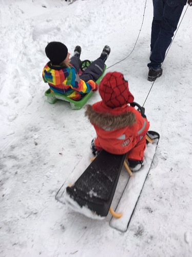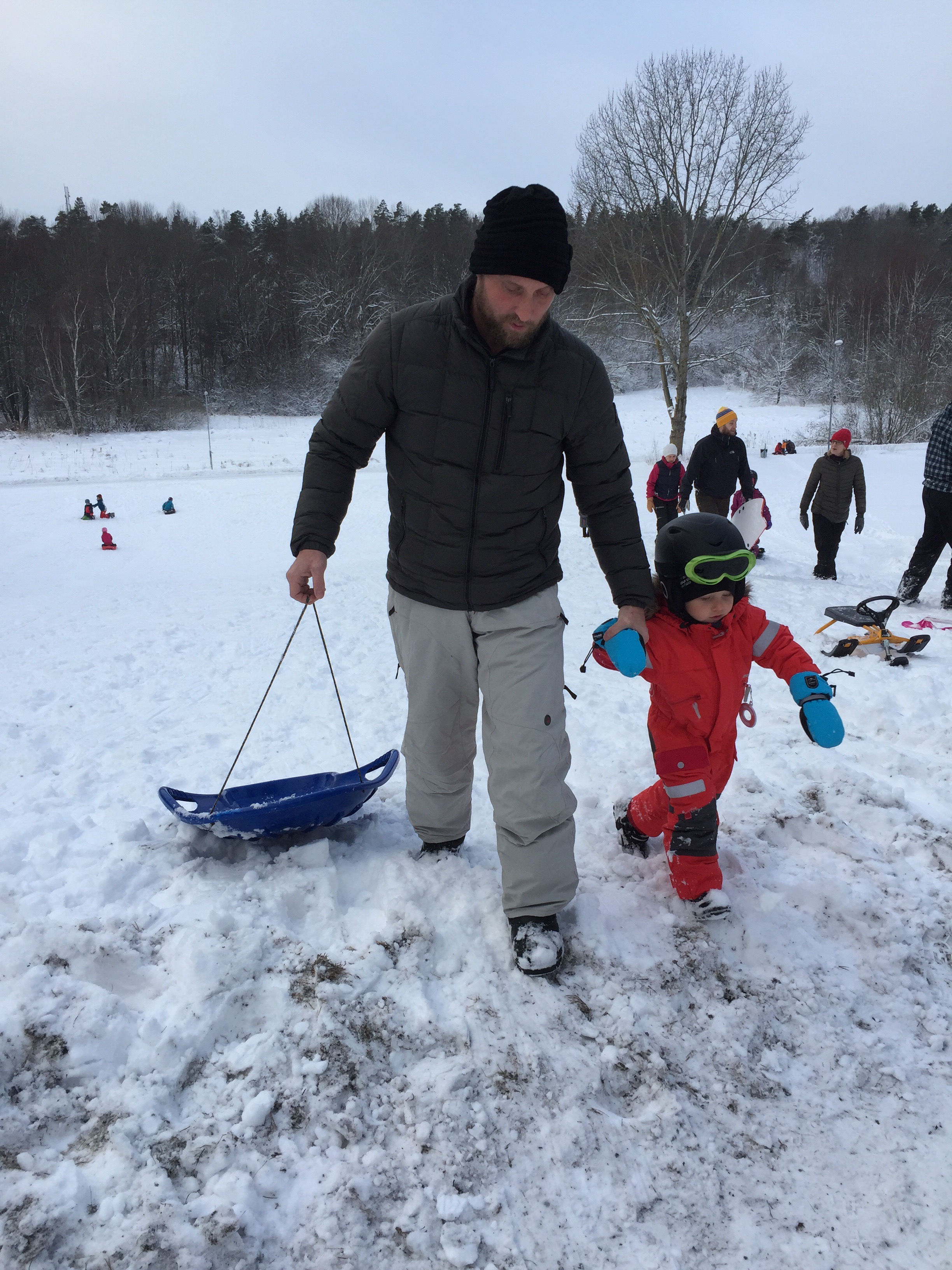 På lördagen så åkte vi pulka med Felix en stund innan vi åkte hem till Andrew och Emelie där det också skulle åkas pulka och bada jacuzzi. Det var en väldigt trevlig kväll, men med tre barn som försöker riva huset (och en bebis som hejar på) så blev det inte någon lugn kväll. Det är väl kanske tio år kvar tills det kan bli det igen.