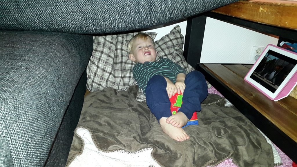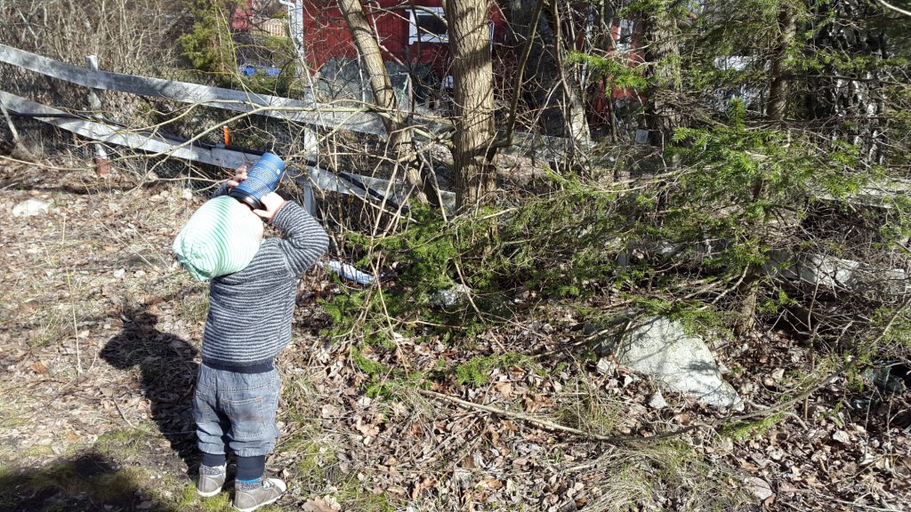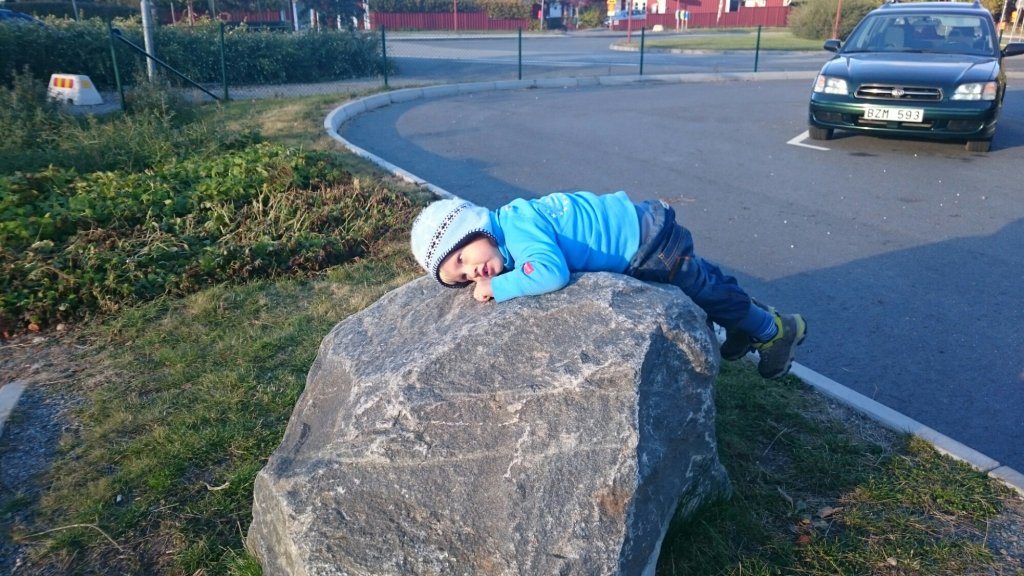När han piggnar till så leker han med lådor. Han sitter i dom, har dom på huvudet och använder dom som pall för att komma åt saker han inte ska komma åt.