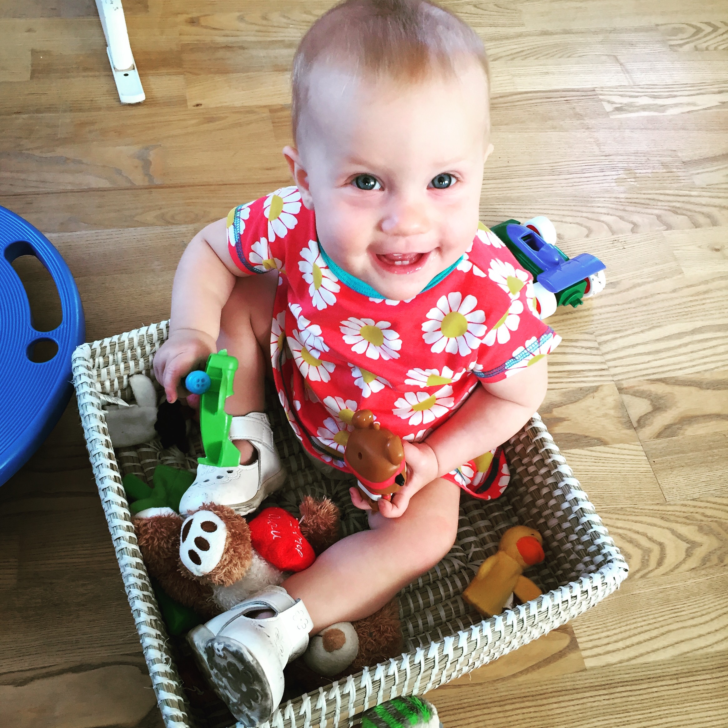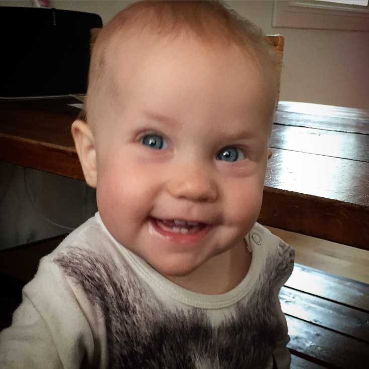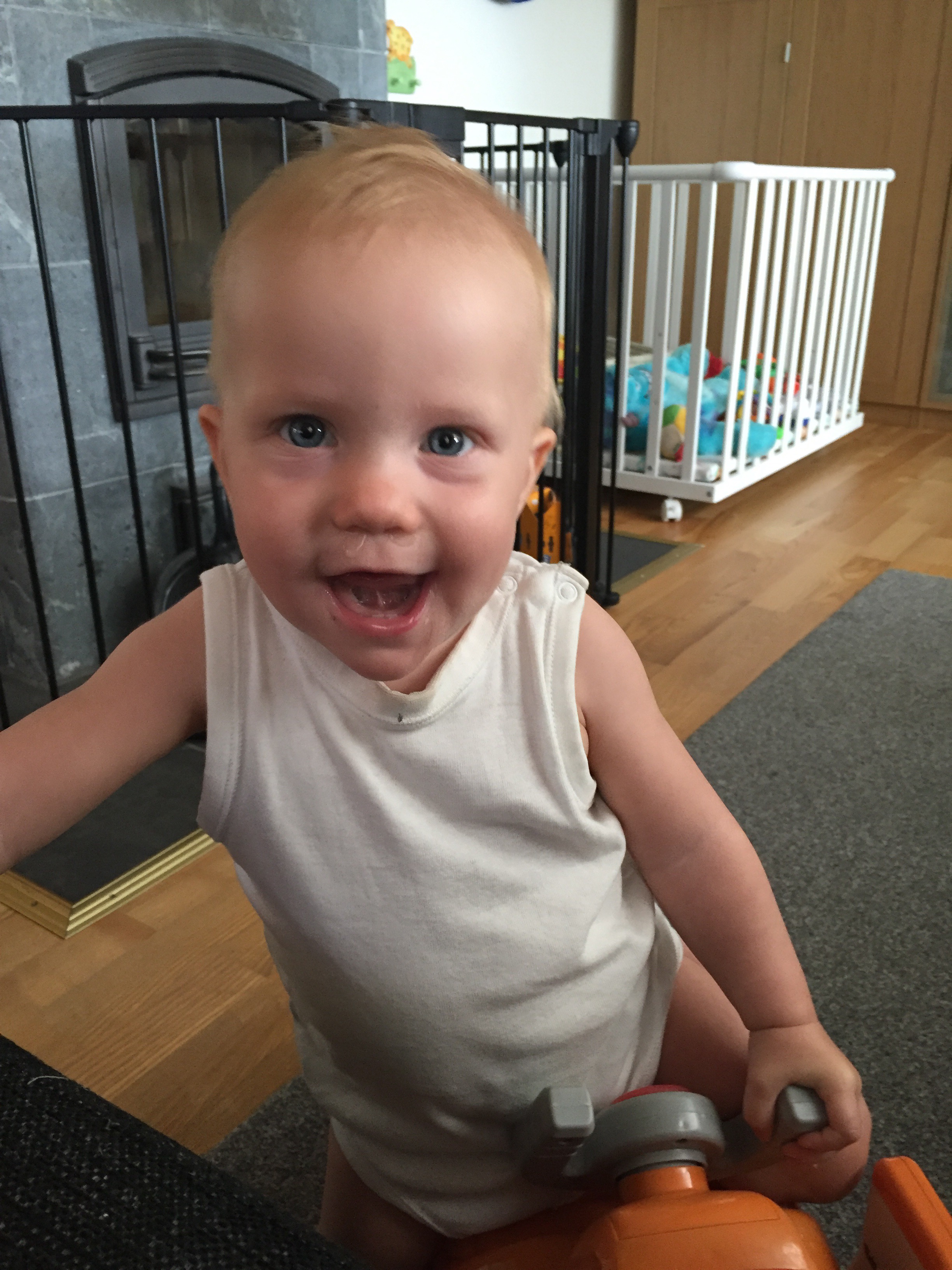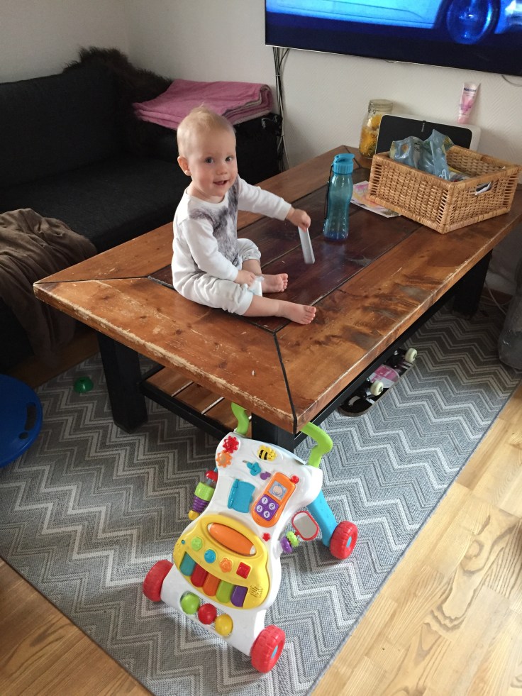 Tuva är i en mer begränsad form men ändå mer nyfiken är Felix var i den åldern, tror jag. Jag är övertygad om att hon är så svårsövd för att hon inte vill gå miste om någonting som kanske kan hända när hon sover. Hon kan vara hur trött som helst men kämpar med alla medel mot sömnen. Häromdagen stod hennes gåvagn mot bordet och då upptäckte hon att hon kunde klättra upp på bordet. Sen när hon insett det så hittade hon andra saker att använda för att komma upp. Hon snappar upp så många saker just nu, men vänder man ryggen åt henne så kryper hon snabbt bort till kattmaten eller kattlådan. Mmmm mums. ALLT ska in i munnen, hon är som besatt.