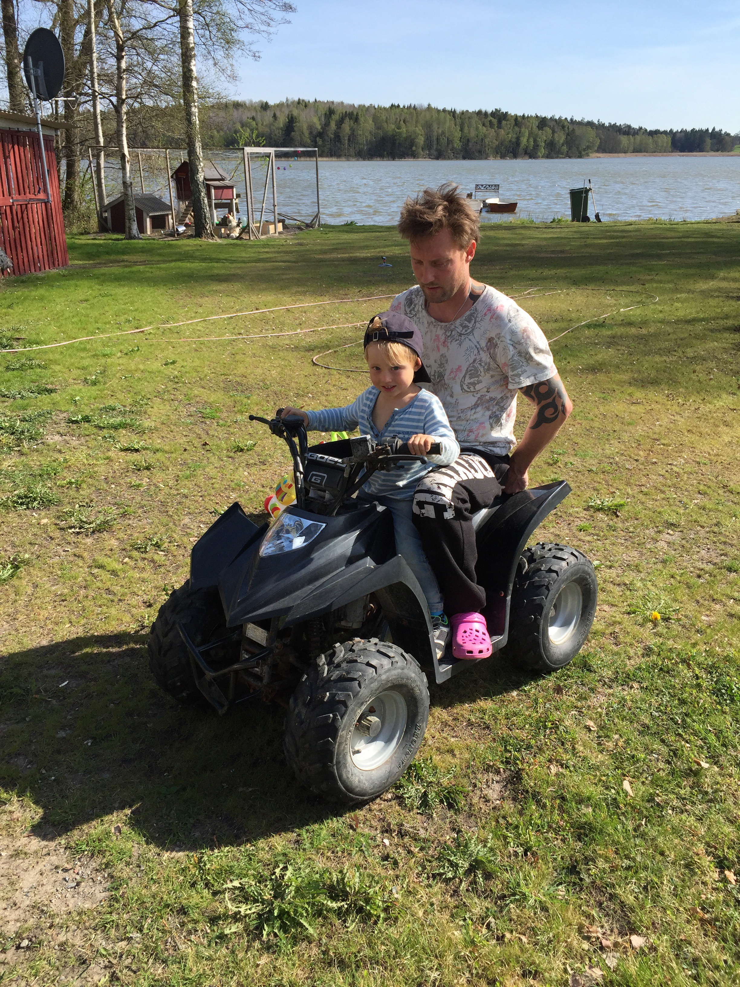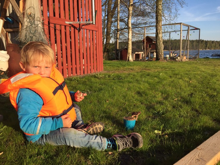 Nu är det dags att börja med maten för alla oss och inkommande gäster. Jag skivar och steker korv, byter bajsblöja och kokar makaroner, dukar, plockar ner Tuva från diverse möbler, hindrar Felix från att göra fällor för Tuva, dukar och torkar Felix när han är klar på toaletten (vi har tagit bort pottan nu). Kenny ringer och säger att han ska möta upp sin jobbarkompis som ska lämna tillbaka vår båt. ”Vi kommer hem med pizza sen.” Han har glömt att alla är här. Nej Kenny, alla är här och vi ska äta köttbullar och korv nu, det får bli en annan dag.